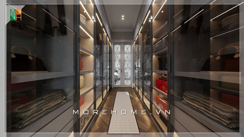 Ấn tượng với sự tiện lợi, hiện đại của thiết kế nội thất nhà phố có tủ quần áo lớn dài kết hợp gỗ và kính thuận tiện cho việc lựa chọn và sắp xếp.