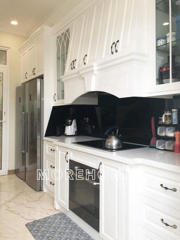 Hình ảnh của việc thi công tủ bếp tân cổ điển được phun sơn trắng tại biệt thự Ciputra, Tây Hồ, Hà Nội đã được thực hiện.