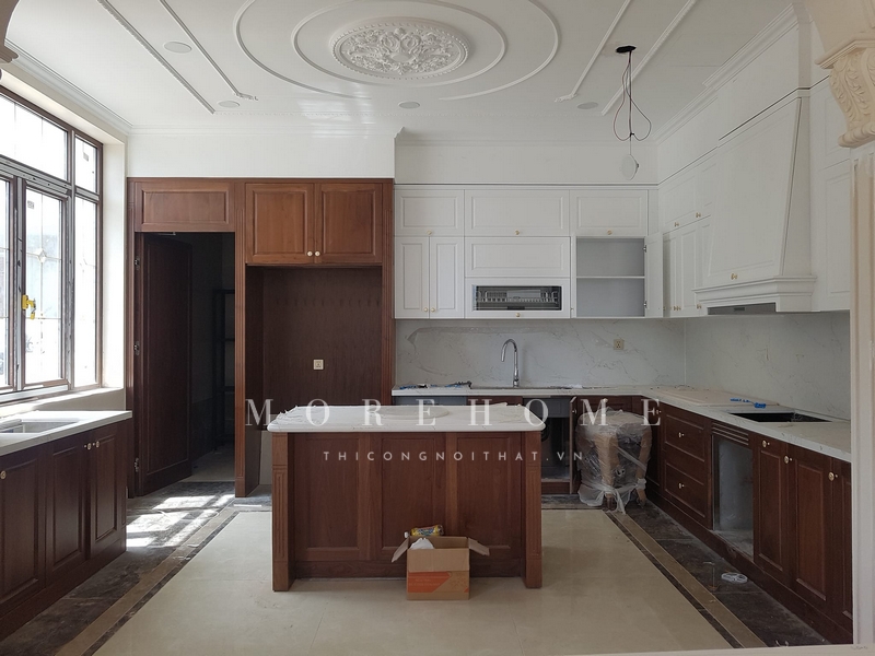 Việc thi công tủ bếp gỗ tự nhiên giúp tạo nên một phong cách tân cổ điển cho căn biệt thự cao cấp.
