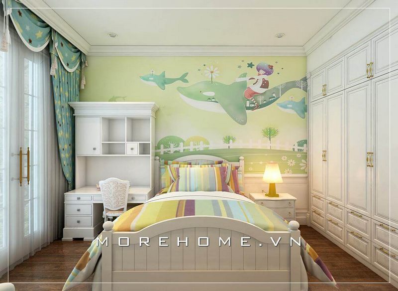 Phòng ngủ của bé trai được trang bị nội thất hiện đại, đẹp mắt, có một điểm nhấn độc đáo là mẫu giấy dán tường 3D hoạt hình ấn tượng.